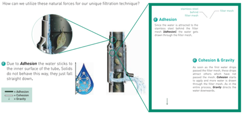 The unique filtration technique of our rainwater harvesting system revolves around the natural forces applied to water – Adhesion, Cohesion & Gravity.