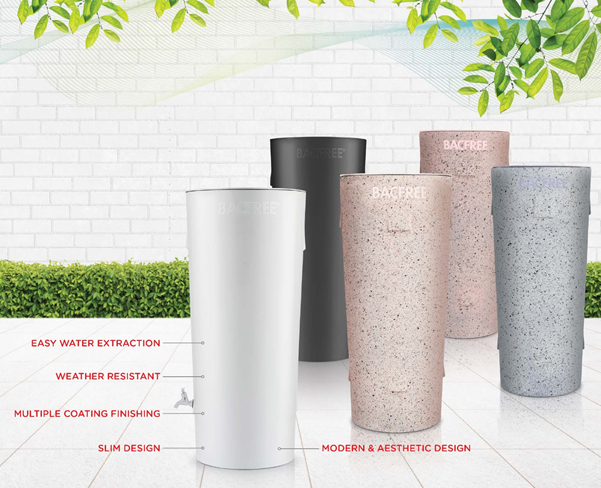 Bacfree’s customisable tanks are designed to fit in any premise.Its tough UV-stabilised material prevents fungus and mossgrowth as well.