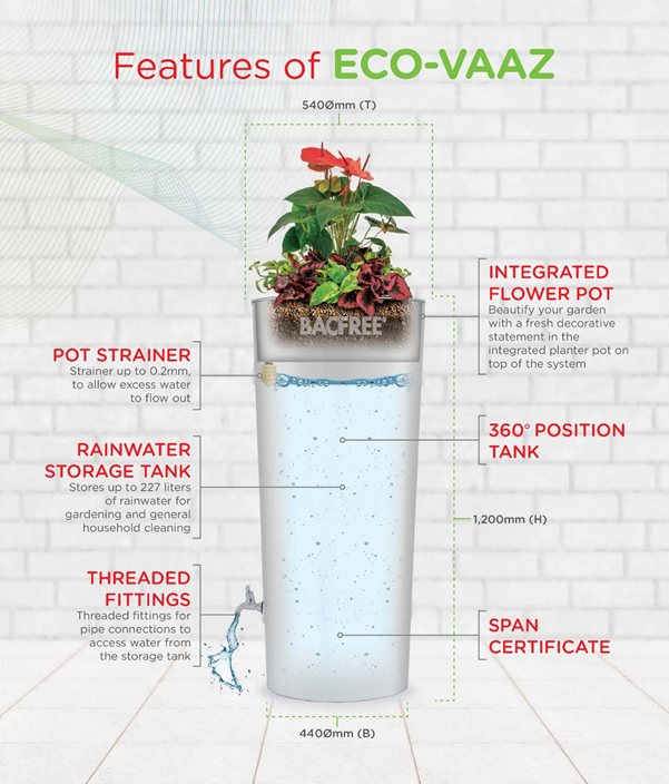 With the dual-function Bacfree decorative rain harvesting system integrated with planter pot, start saving water, time and money for a healthier, prettier garden today!